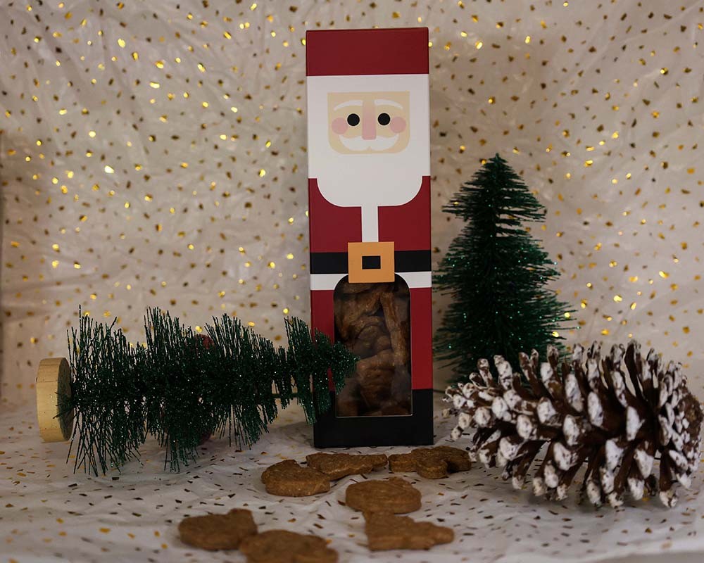 Santa Paper Box with Window filled with 20 Dog Treats! This makes the cutest gift for a friend or a hostess gift if you are going to a party and they have a dog. The box is 2 1/4" x 2 1/4" x 8" Each box is filled with homemade dog treats and you can select the flavor of treats below.