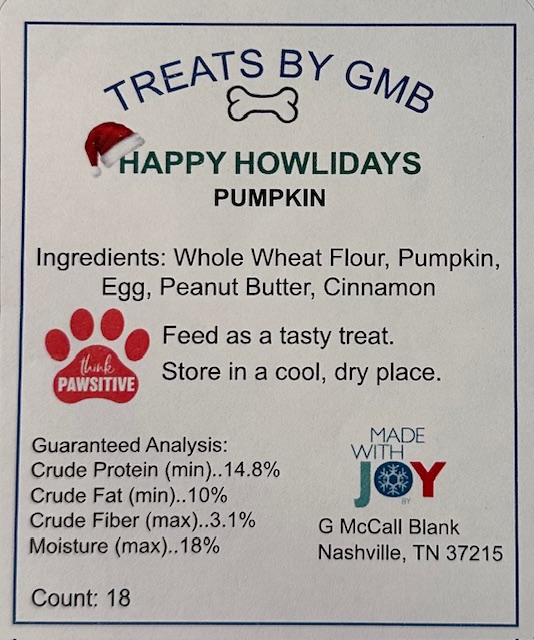Hello from Nashville, Tennessee! Welcome! We are happy you are here and appreciate you purchasing our products. I’m Glenda and I make the treats along with my husband, Joe. At Treats by GMB, every batch is baked with love in Nashville. We specialize in locally made, small-batch dog treats using high-quality human grade ingredients that everyone can pronounce - with grain-free and seasonal options your pup will love. Our commitment to quality means our treats are free from any preservatives, additives, fillers or dye, and have been rigorously taste-tested by our canine team and ourselves. Each recipe undergoes professional laboratory testing for the guaranteed analysis, and our packages include AAFCO labeling. Our operations are licensed and comply with Department of Agriculture regulations.