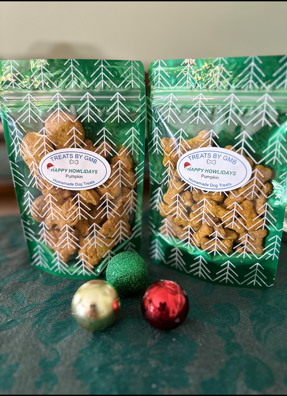 Available Now! - Our Happy Howlidays Pumpkin dog treats are crafted with high-quality, human grade ingredients that are easy to recognize and pronounce. Each treat is made with whole wheat flour, pumpkin, eggs, peanut butter and cinnamon. We use 100% pure pumpkin and only use the cinnamon identified by Consumer Reports as the safest grocery store cinnamon brand. The package includes 20 holiday themed pieces. The pieces are approximately 1½ inches wide, perfect for rewarding your dog with a tasty snack. To maintain freshness, store the package in a cool, dry place. Our commitment to quality is underscored by our licensure with the Department of Agriculture. We list all the ingredients and the guaranteed analysis on each label. As each beloved dog is unique and may have specific dietary needs, please review the ingredient list carefully and consult with your veterinarian if you have concerns about any sensitivities. Each treat has 9 calories.