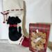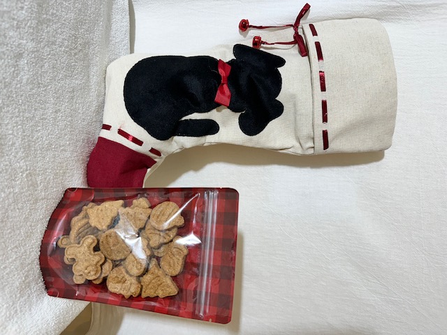 Kickoff the holidays by hanging your beloved pup's Stocking filled with homemade dog treats! This stocking is off white trimmed with maroon ribbon and has a maroon fabric toe. There is a large silhouette of a black dog on the front with a maroon bow on its collar. The stocking has a hang tag on it and at the longest part is about 17 inches tall. This pretty off white and maroon dog stocking comes with your choice of Homemade Dog Treats! You can select the flavor of treats below. The Peanut Butter treats are made with whole wheat flour, peanut butter, eggs and honey. The pumpkin treats are made with whole wheat flour, 100% pumpkin puree, eggs, peanut butter and cinnamon. The Bacon, Egg and Cheese treats are made with Bacon, Egg, Cheese and Oat Flour. The Grain Free Gluten Free Treats are dairy free and made with 100%Pumpkin Puree, Coconut Flour, Cage Free Eggs, Turmeric, and Cinnamon. For all our products that contain cinnamon, we only use the cinnamon identified by Consumer Reports as the safest grocery store cinnamon brand.